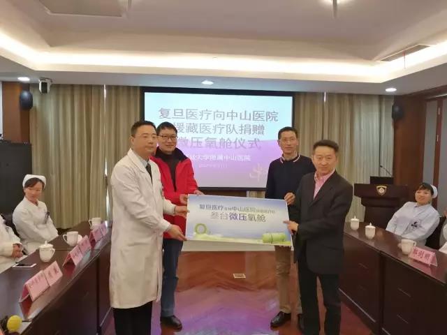 上海復旦醫院管理有限公司董事長章濱云先生代表復旦醫療向中山醫院援藏醫療隊捐贈了三臺微壓氧艙設備,用于保障醫療隊成員進藏后的健康安全。